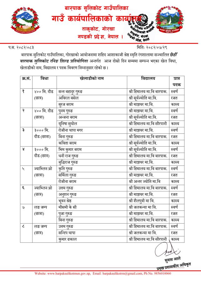 Home » छैठौँ बारपाक बारपाक सुलिकोट रनिङ शिल्ड प्रतियोगिता अन्तर्गत पहिलो र दोस्रो दिन सम्मको नतिजा प्रकाशन गरिएको सूचना।