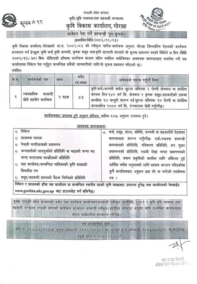 व्यावसायिक तरकारी खेती सहयोग कार्यक्रमको लागि आवेदन पेश गर्ने सम्बन्धी पुन:सूचना !!