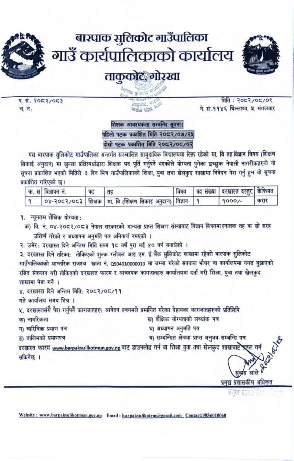 शिक्षक आवश्यकता सम्बन्धी सूचना ।।